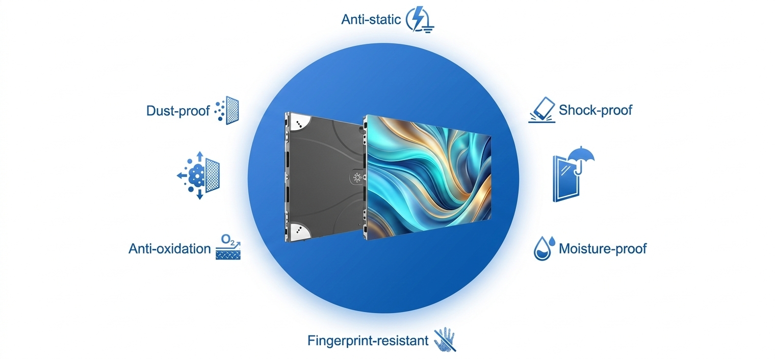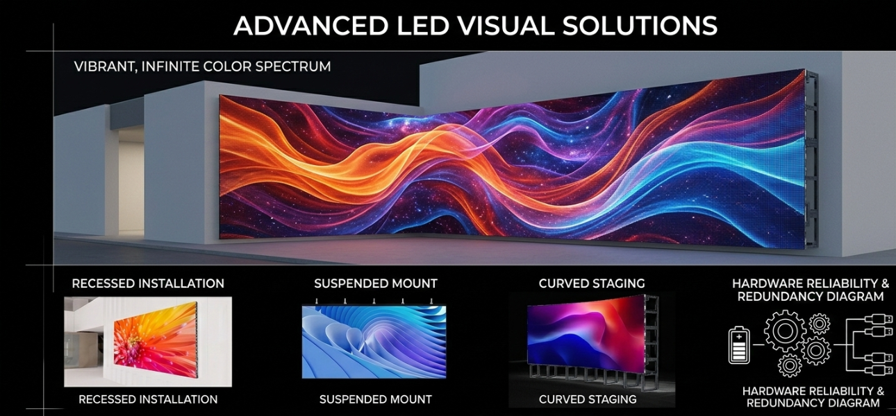 Designed with front serviceability, power/data backup, and an all-in-one structure, it ensures easy maintenance and reliable operation. Installation is flexible with support for wall-mounted, hanging, and curved ground-standing setups.